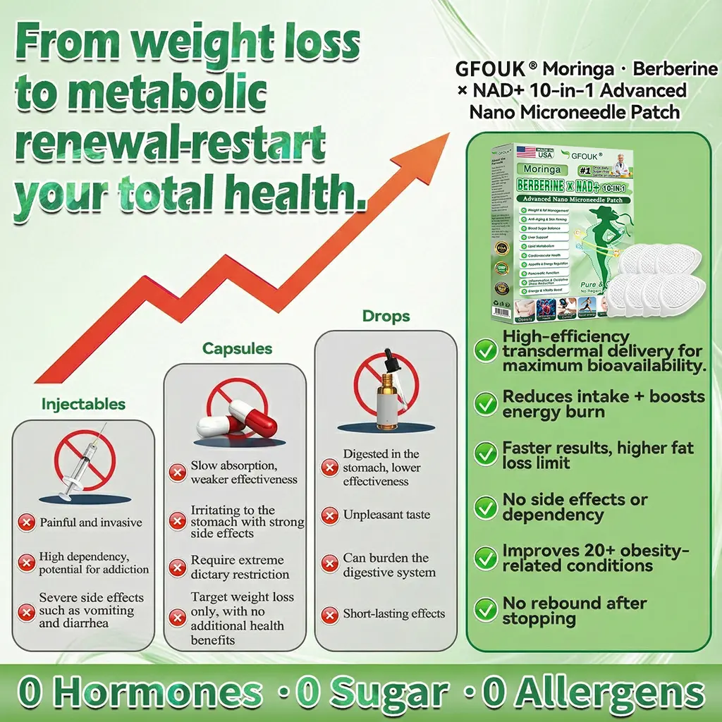 โ GFOUKยฎ๐ด๐๐๐๐๐๐ฎ ยท ๐๐ฒ๐ฟ๐ฏ๐ฒ๐ฟ๐๐ฃ๐ ร ๐๐ผ๐+ ๐๐-๐ข๐ง-๐ ๐๐ฑ๐๐ฎ๐ป๐ฐ๐๐ ๐๐๐ฃ๐ค ๐๐๐๐ง๐ค๐ฃ๐๐๐๐ฅ๐ ๐๐๐ญ๐๐ breaking away from the burden of traditional injectable or oral weight-loss products, this advanced nano microneedle transdermal delivery system gently and steadily releases active ingredients for up to 8 hours. Core ingredients Moringa and Berberine work synergistically to support appetite management and lipid metabolism, making fat loss feel more natural and effortlessโwithout extreme dieting or physical strain. At the same time, NADโบ supports cellular energy levels and skin firmness, helping maintain a healthy, well-toned appearance during body-weight changes. The overall formula is gentle and stable, offering a more comfortable experience for those seeking an effective, non-irritating, and non-injectable approach to weight management.
